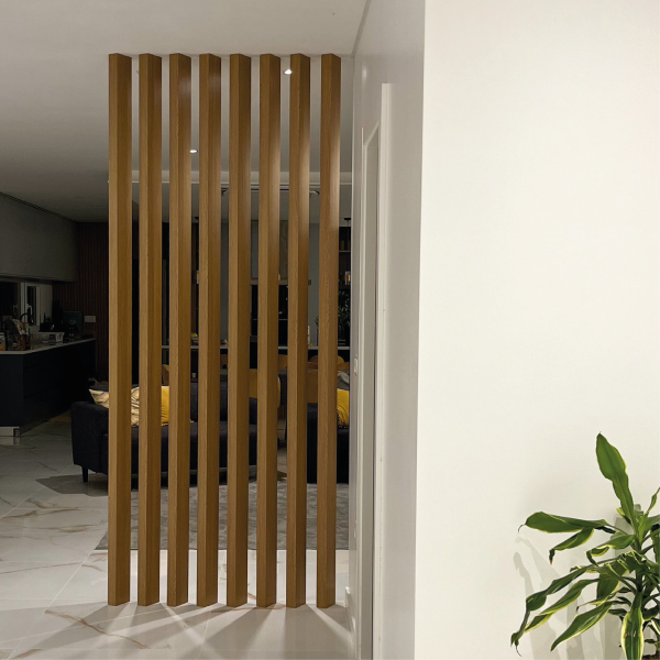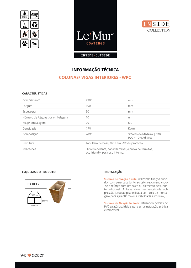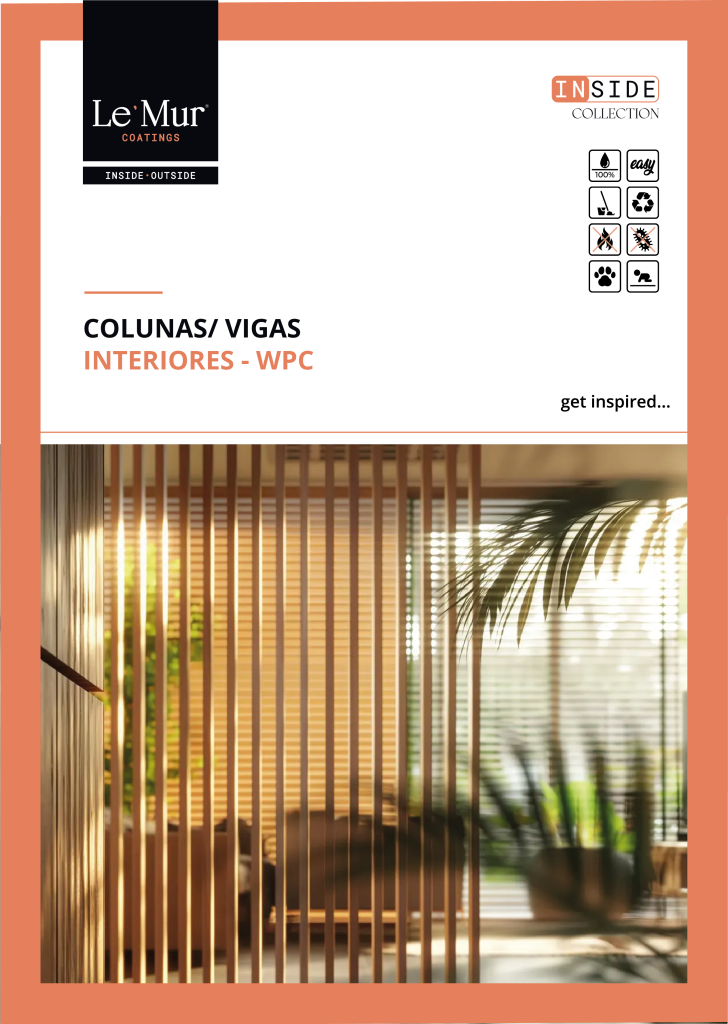 As colunas em WPC (Wood Plastic Composite) da Le´Mur foram desenvolvidas para aplicações exclusivamente interiores, oferecendo uma alternativa contemporânea aos materiais tradicionais. A sua composição combina fibras de madeira e polímeros de alta performance, garantindo estabilidade dimensional, resistência à humidade e superfícies de acabamento uniforme.